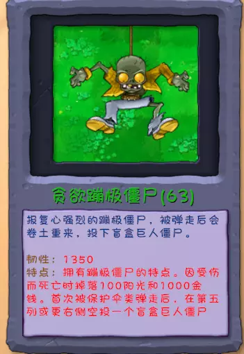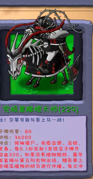 特点:限伤3000,移动速度慢,遇到植物造成秒杀效果,一切植物都能秒杀,并生成三个黑曜石套娃僵尸,攻击时有5%的概率冲撞,冲撞对前方三格内的植物造成6000点伤害,并且自己瞬移,然后召唤一整列黑曜石套娃僵尸,小推车压不死,可以拿起小推车当做他的武器,死亡后在原地生成9个黑曜石套娃僵尸,当自己的剑被打掉后,会用护盾攻击对前方的植物造成30%的伤害,每5秒,当血量低于50%时,会狂飙,移动速度乘二,攻击力乘二,30秒内无敌,但是攻击力改成8000,并且拿起小推车可以拿起超过10个,对本行所有植物造成秒杀式效果。