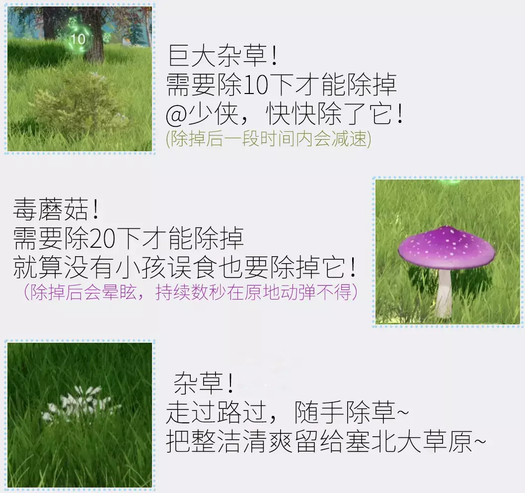 ⭐还可以感受除草的快乐!成为草场上的除草King!一次性除掉更多的草、走路更快!大侠,塞北草原风貌就靠你了!“看我一人除俩!”