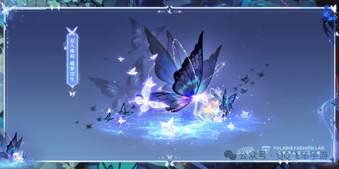 双人座椅·蝶梦浮生主体为一只巨大的蝴蝶,羽翼晕染着幽蓝光泽,似藏着神秘星河。周围簇拥着灵动的小蝴蝶,闪烁微光,似洒落的细碎星芒。