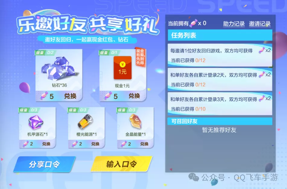 5月28日-6月22日,邀请好友回归赢好礼啦!车手们邀请满足条件的好友回归游戏或与单个好友同时累计登录一定天数即可获得一定数量的糖果,使用糖果即可兑换现金/Q币、钻石、机甲源石、橙光能源、金晶能量等好礼!