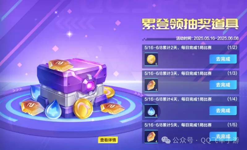 5月16日-6月8日,车手们每日登录游戏并完成一局比赛,累计达到指定天数即可领取金晶能量、星愿水晶、摘星币等钻石抽奖道具哦~