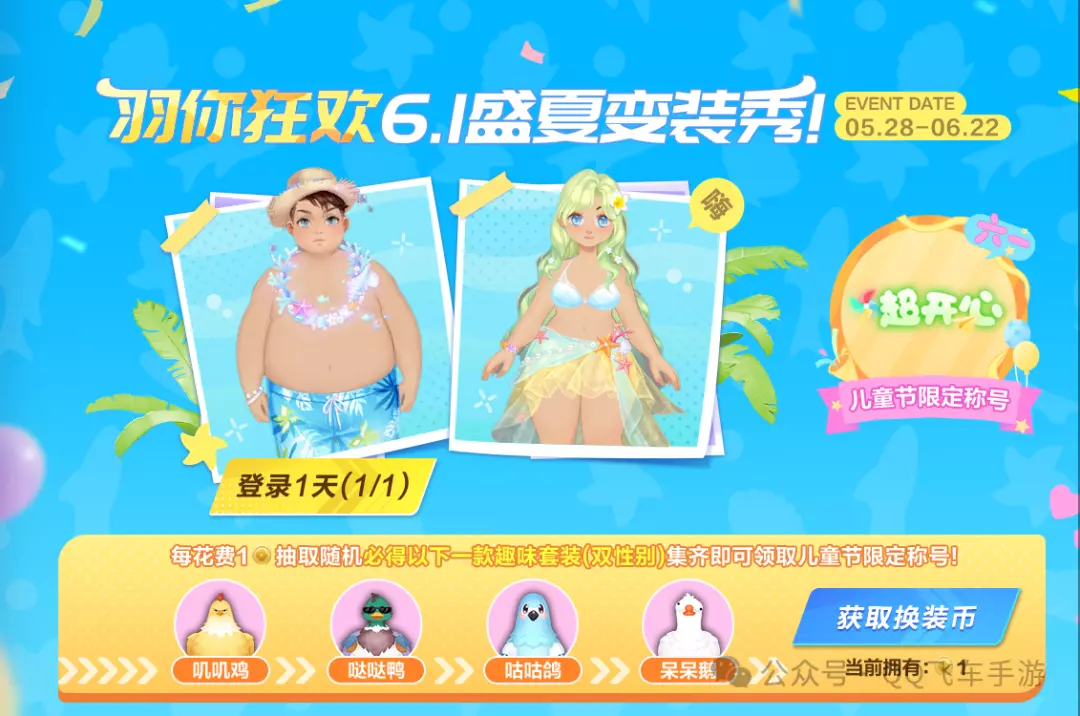 5月28日-6月22日,车手们累计登录1天、4天即可领滨海夏日套装(双性别)!另外,车手们花费6元即可获得1枚换装币,消耗1枚换装币可随机抽取叽叽鸡、哒哒鸭、咕咕鸽、呆呆鹅4款搞怪鸟类套装之一!集齐全部套装可得限定称号~