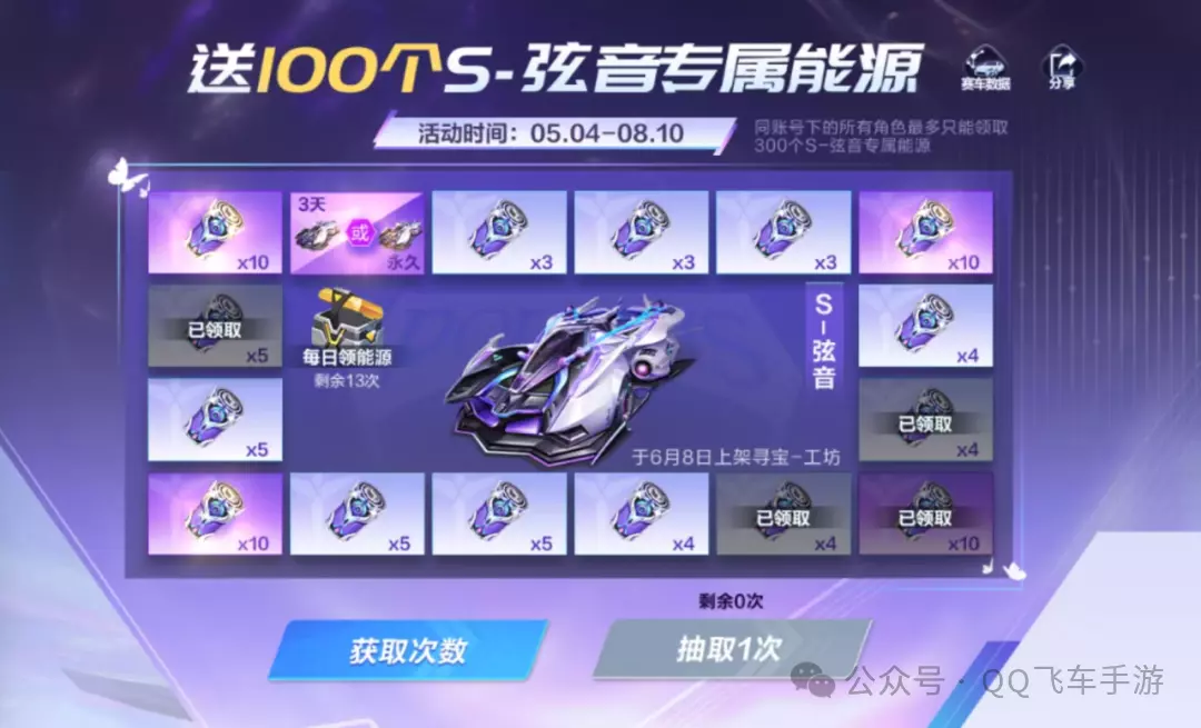 5月4日-8月10日,车手们每日登录游戏前往活动页面即可领取1个S-弦音专属能源,最多可领取15个S-弦音专属能源~此外,车手们完成指定任务还可以参与抽奖,累计必得85个S-弦音专属能源,更有机会直接获得永久A车S-弦音!