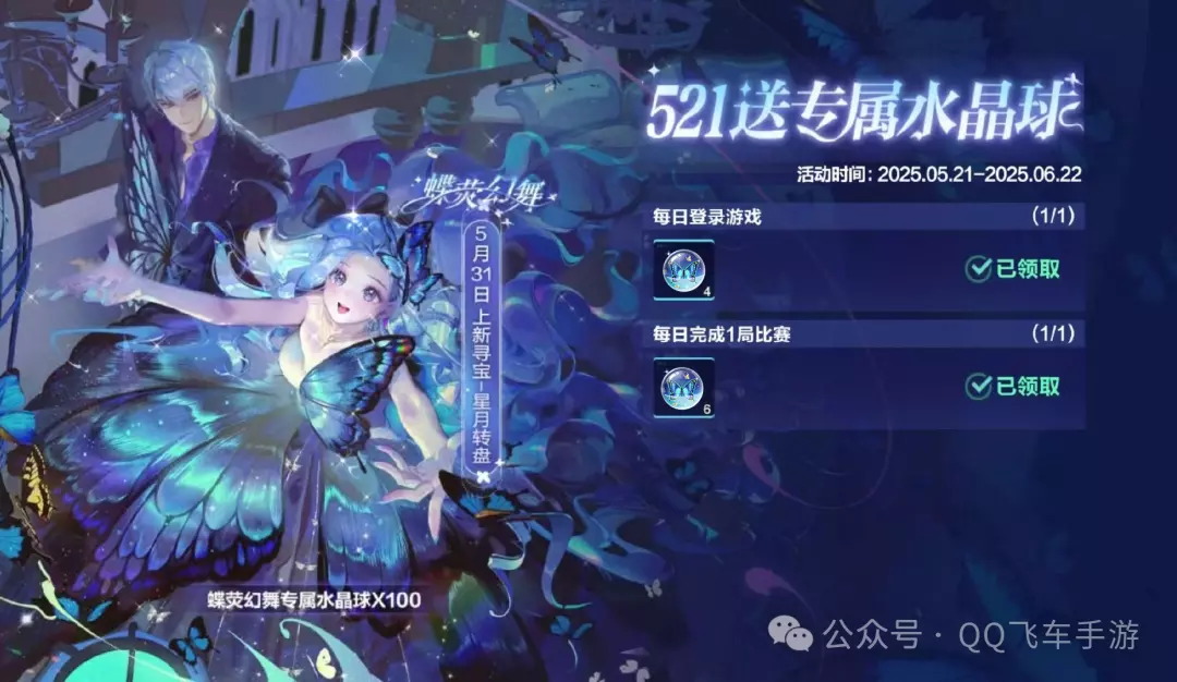 全新魔法套装「蝶荧幻舞」将于5月31日上线!100个专属水晶球免费放送~5月21日-6月22日,车手们每日登录游戏并完成1局游戏对局可领取10个专属水晶球,累计最多可得100个专属水晶球~
