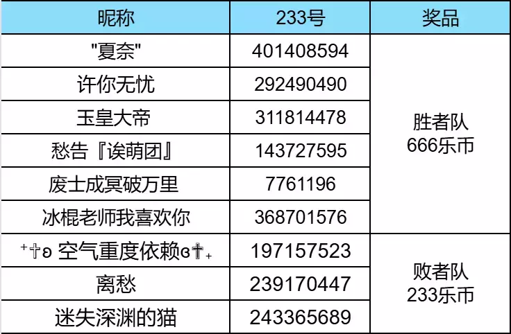 从最多人支持的阵营中选出6位获得666乐币,败者阵营选出5位233乐币。