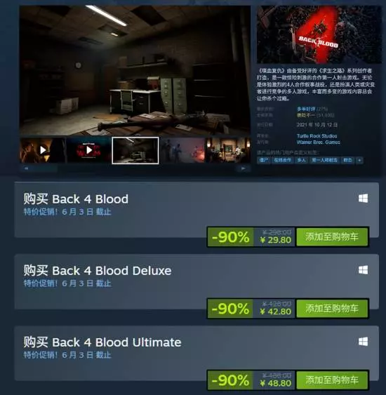 此外,《求生之路》系列同类型“精神续作”《喋血复仇》同样获得了-90%折扣,折后价仅需29.8元!
