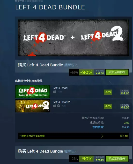 提到僵尸游戏,那就不得不提传奇合作打僵尸射击游戏《求生之路2》。这款神作在本次活动中再度获得-90%的高额折扣,售价来到了史低4.2元。其前作《求生之路》同样低至4.2元,而包含两部作品的捆绑包售价为6.3元。