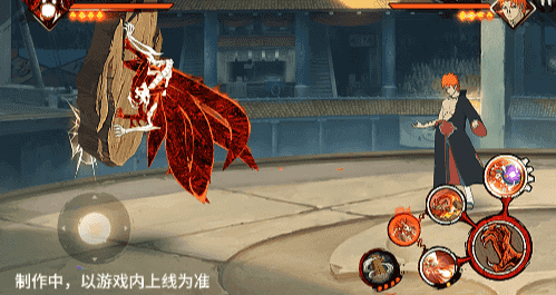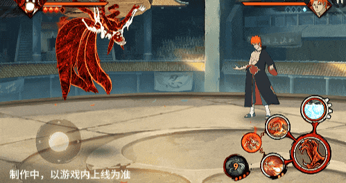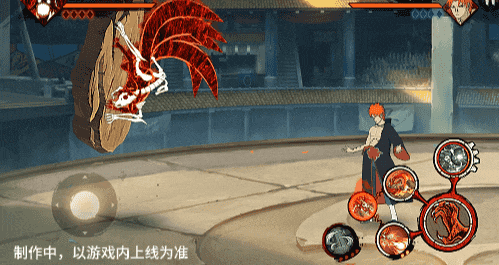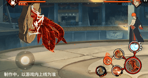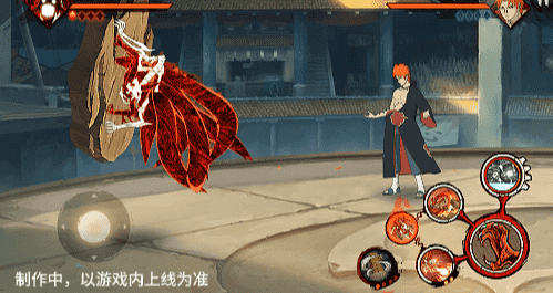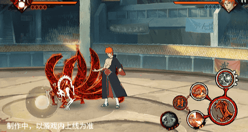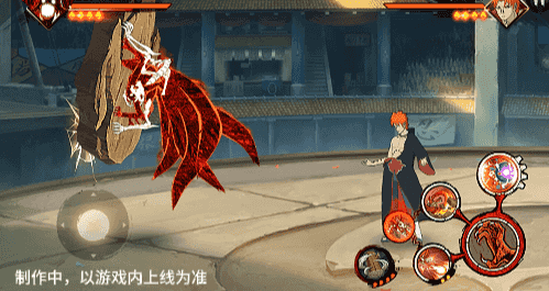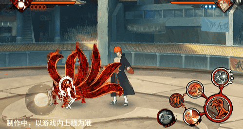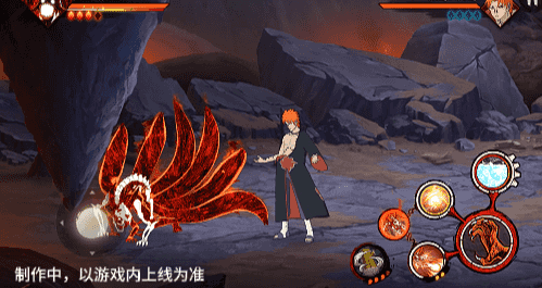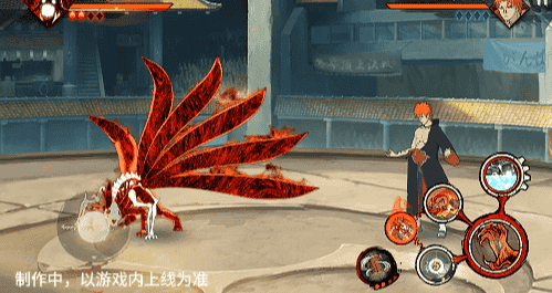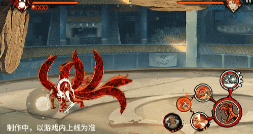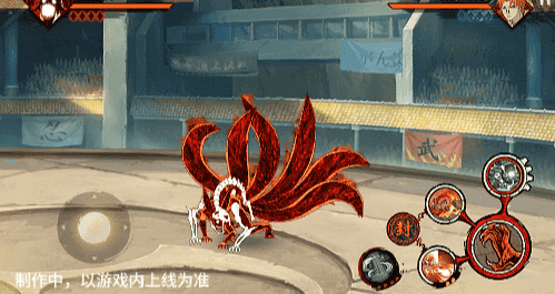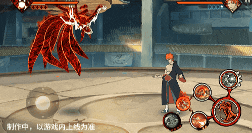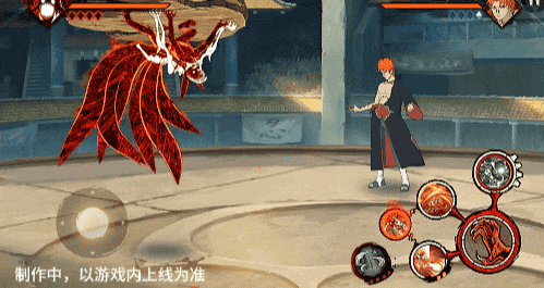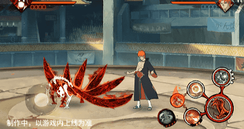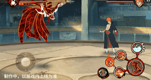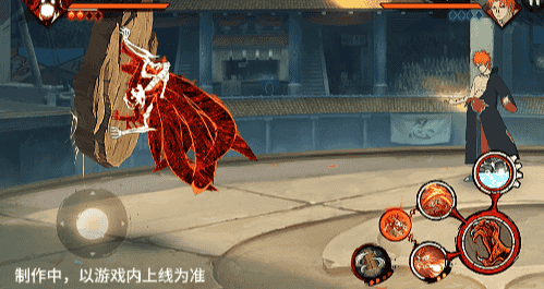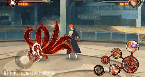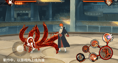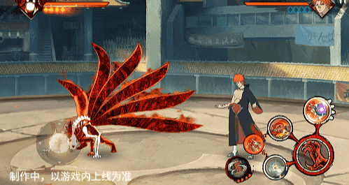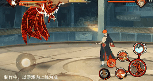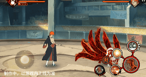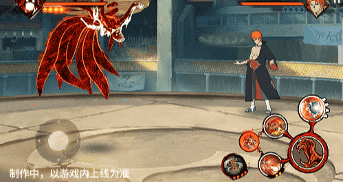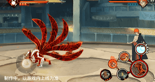 在六尾鸣人处于侧板边地形上释放一技能,释放的激光会向前半弧横扫,扩大Y轴的攻击范围,在侧板边通过一技能划普攻释放查克拉炮时,可以通过拉动上下摇杆控制查克拉炮的发射方向。