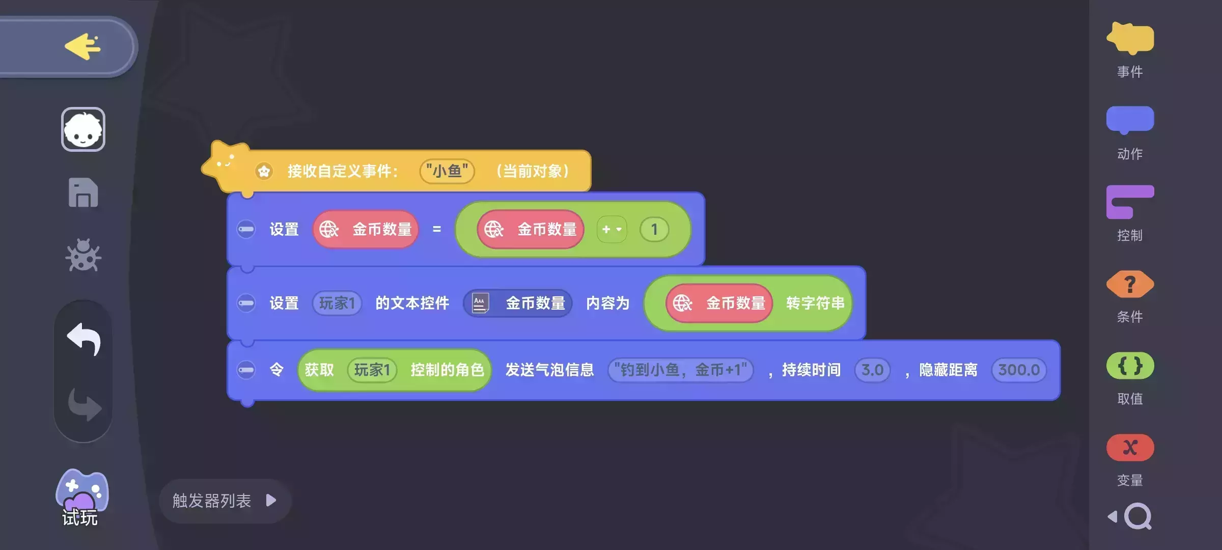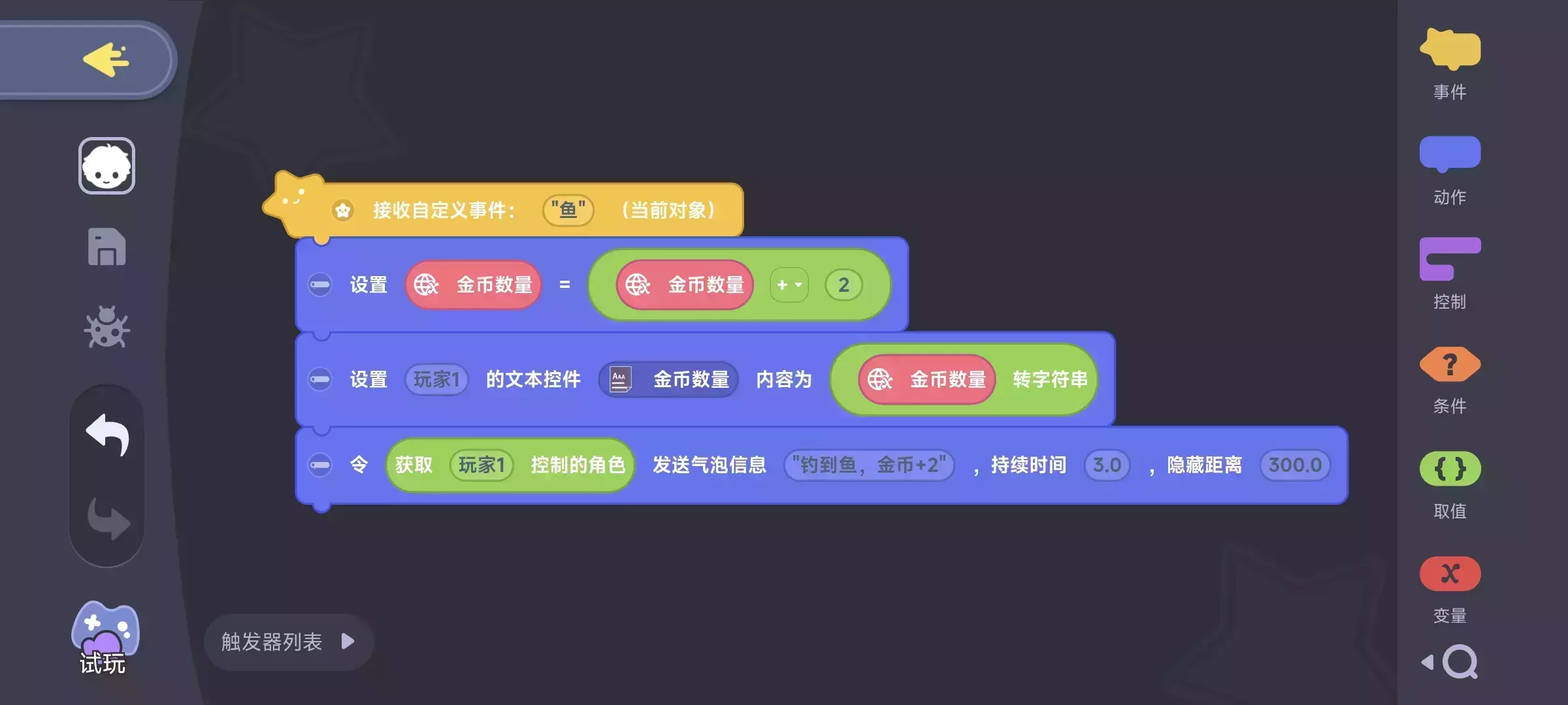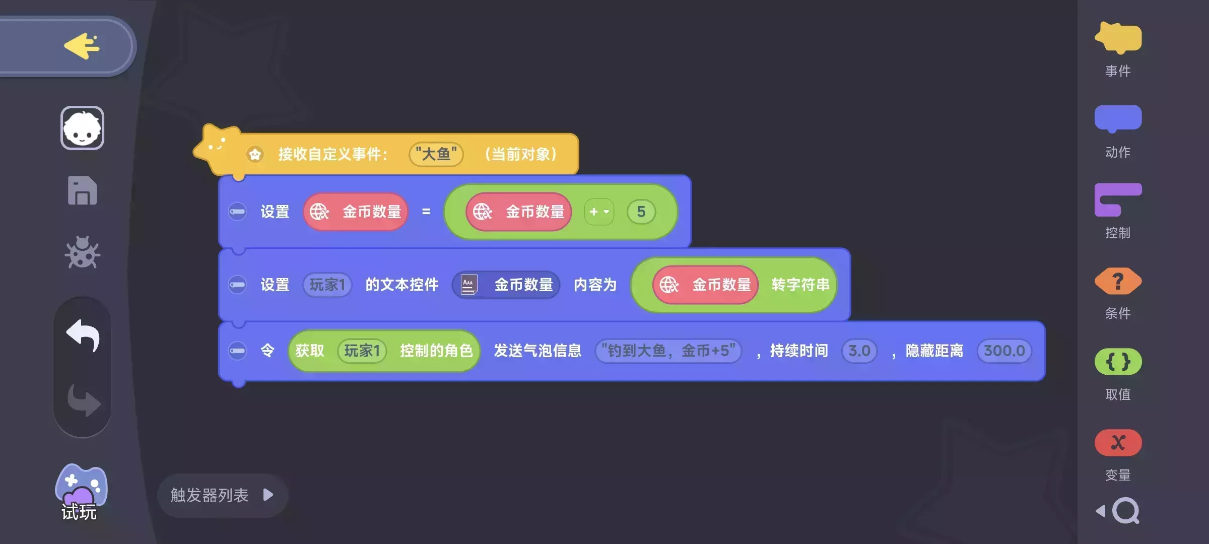 “鱼”事件→触发这段积木编程:
