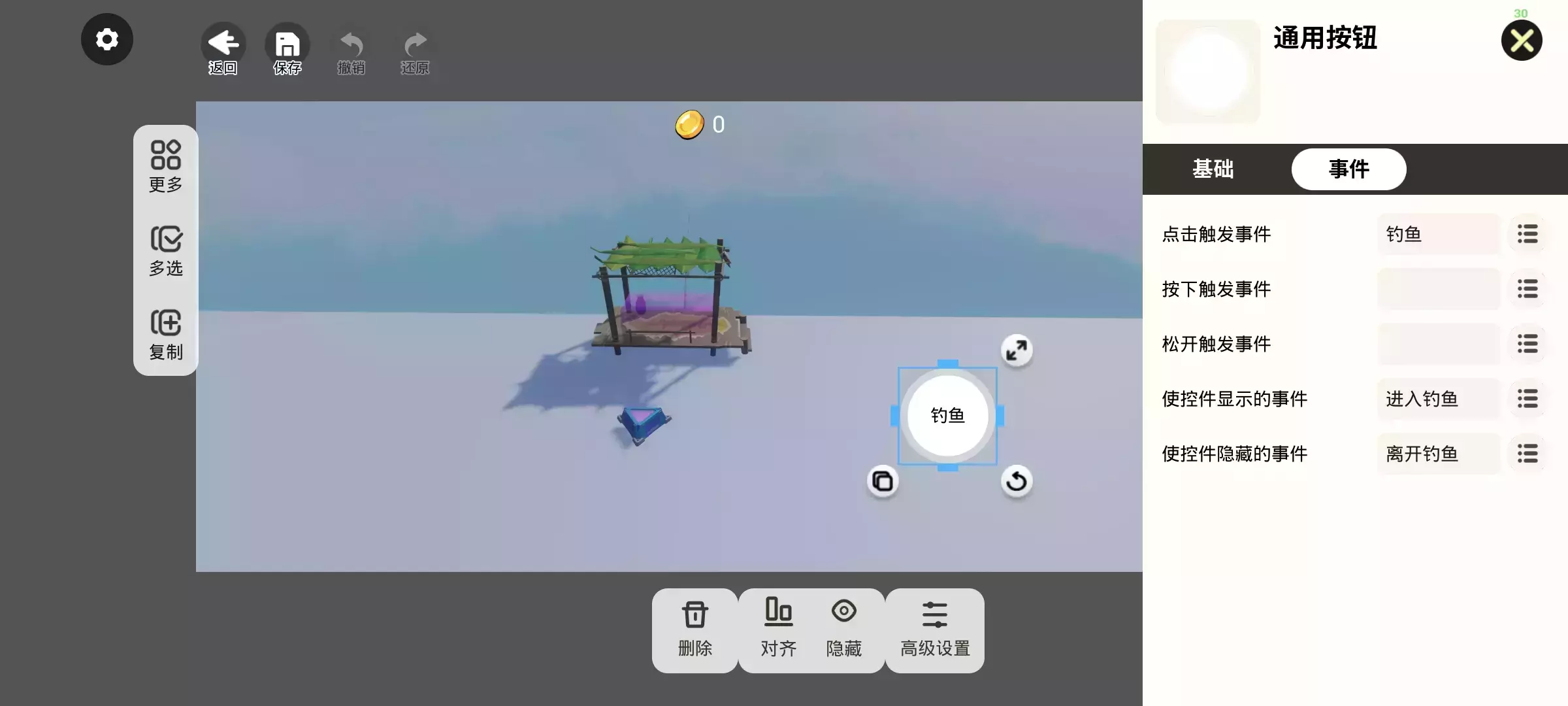 “进入钓鱼事件”→使钓鱼按钮显示出来;点击钓鱼按钮→触发“钓鱼”事件: