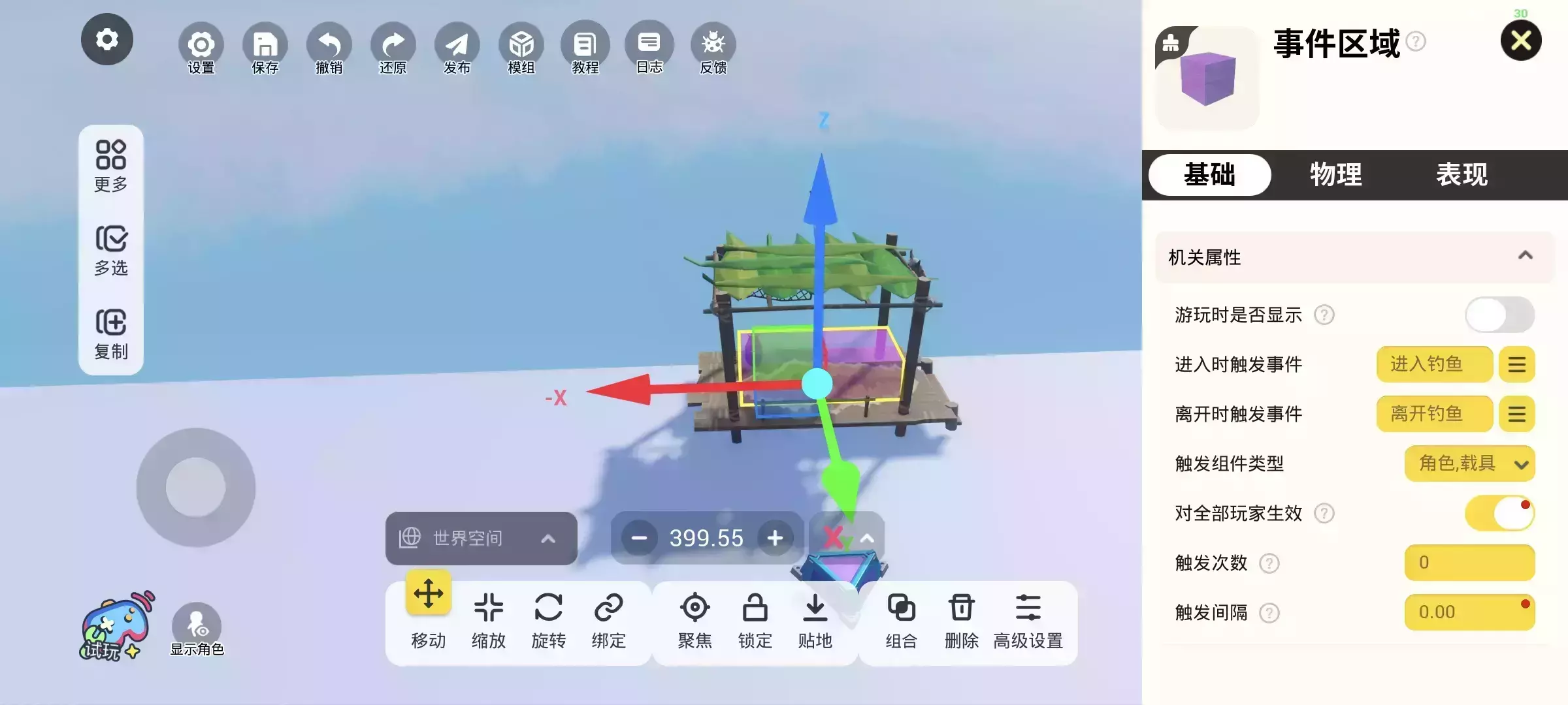 进入事件区域,触发“进入钓鱼事件”: