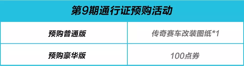 结束也代表着新的开始!第9期通行证预购即将开启,活动期间,参与不同版通行证预购即可获得传奇赛车改装图纸、100点券好礼。