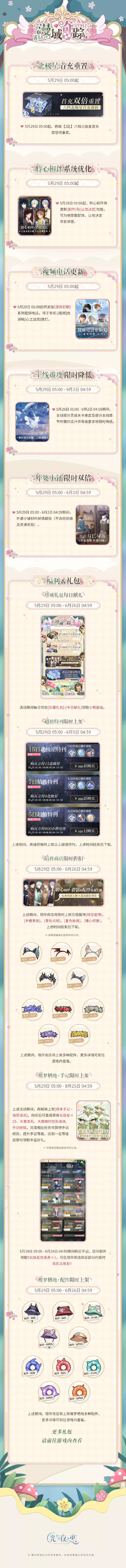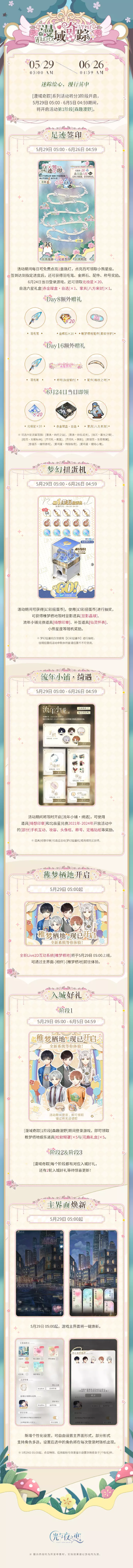 5月29日 05:00 - 6月26日 04:59期间将限时开启[流年小铺・绮遇],可使用道具[绮想印章]和北极星兑换2021年-2024年开放活动中的[部分]手机互动、妆容、头像框、称号、定格贴纸等奖励。