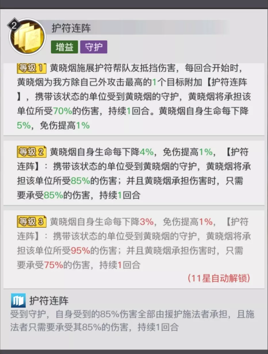 每回合开始时,黄晓烟为我方除自己外攻击最高的1个目标附加【护符连阵】,携带该状态的单位受到黄晓烟的守护,黄晓烟将承担该单位所受95%的伤害,持续1回合。黄晓烟自身生命每下降3%,免伤提高1%。