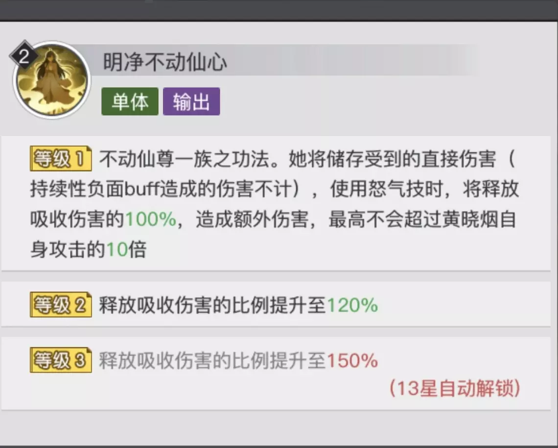黄晓烟将储存受到的直接伤害(持续性负面buff造成的伤害不计),使用怒气技时,将释放吸收伤害的150%,造成额外伤害,最高不会超过黄晓烟自身攻击的10倍。