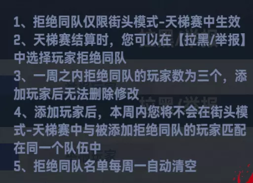 黑名单功能优化:新增拒绝同队功能,街头赛后可以选择将对局中的玩家加入拒绝同队名单,本周天梯赛不与被标记玩家同队(自行组队除外),一周限标记三人,每周一刷新名单。