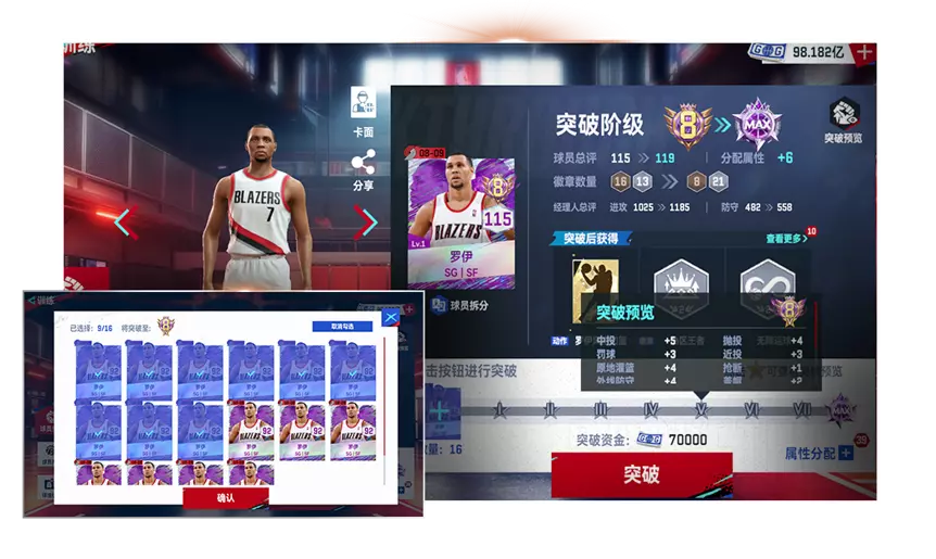 球员突破系统阶级细化:球员阶级内设不同等级子星级,用对应球员卡数量可突破至x阶x星,星级突破将影响球员属性、动作、增益(不增加徽章)。