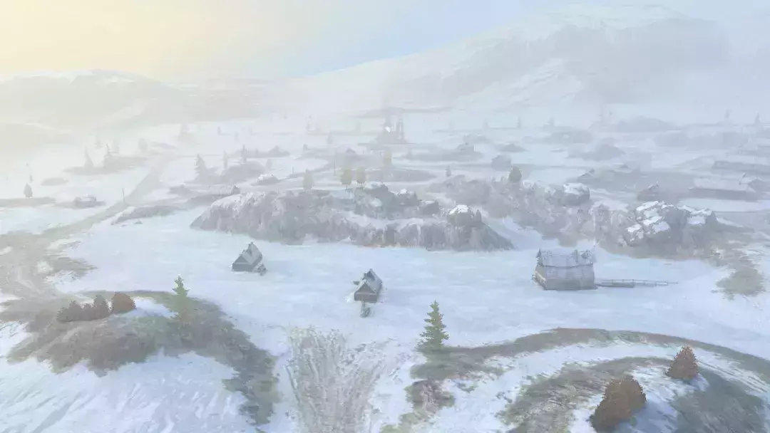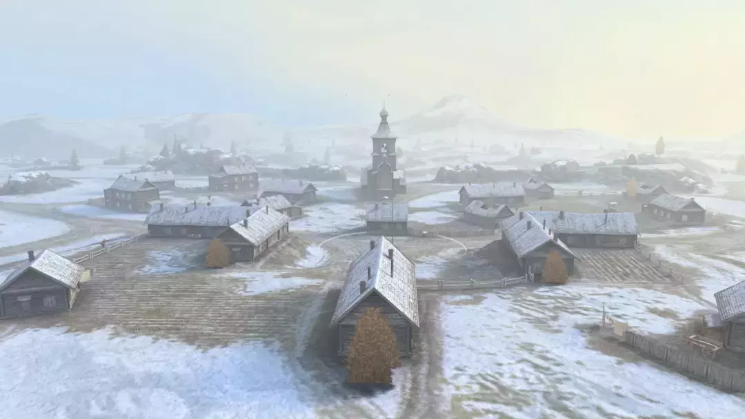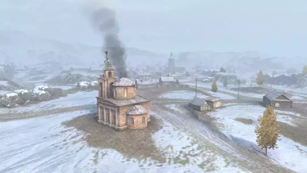 凛冬已至,银白世界尽显肃杀。教堂突兀于雪地,残破尖顶黑烟滚滚,如黑暗信号划破苍穹,仿佛听见了昔日的战火声...