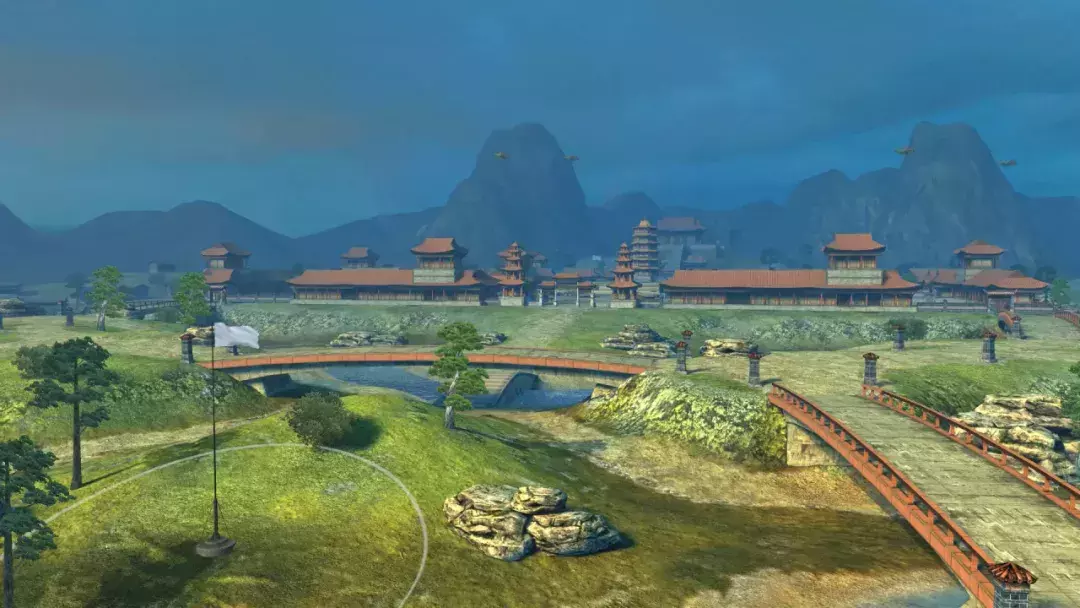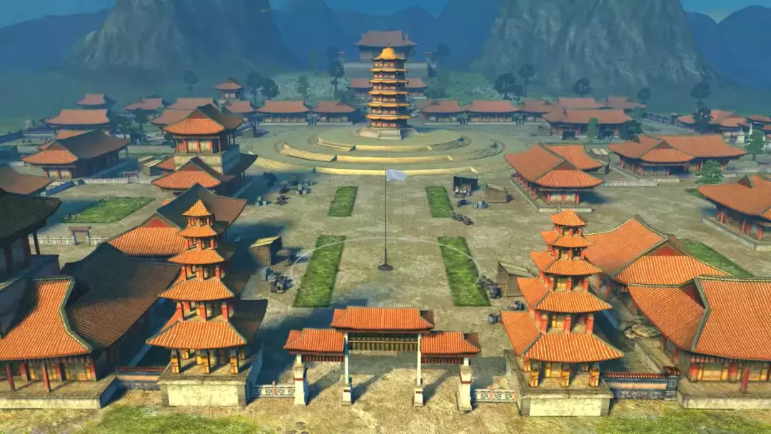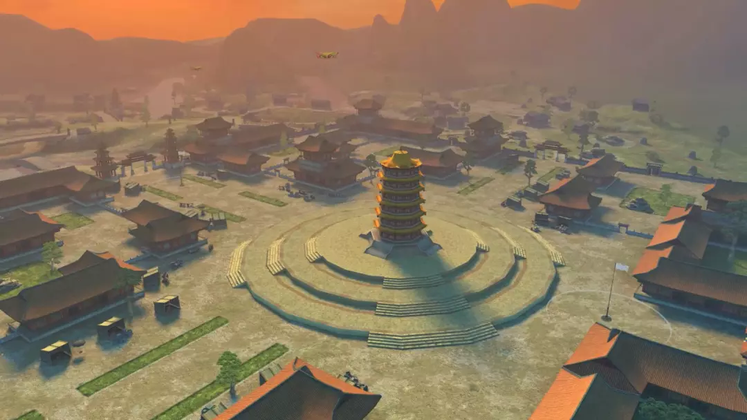 夕阳西下,余晖将“古迹迷坛”染成一片暖橙。地图中央,宝塔巍峨矗立,错落有致的建筑环绕四周,红瓦飞檐,古朴典雅。