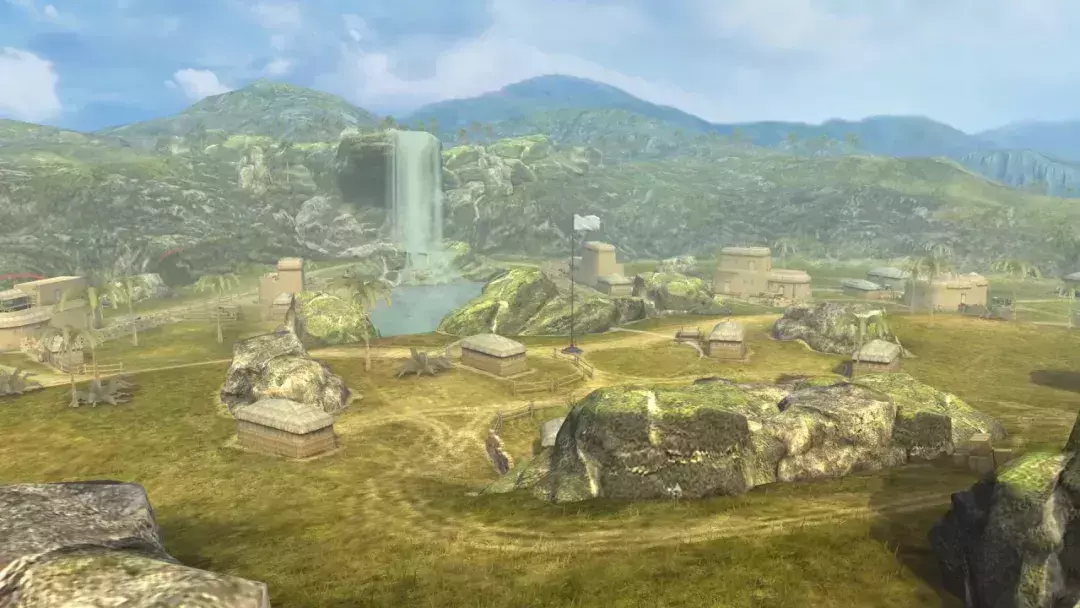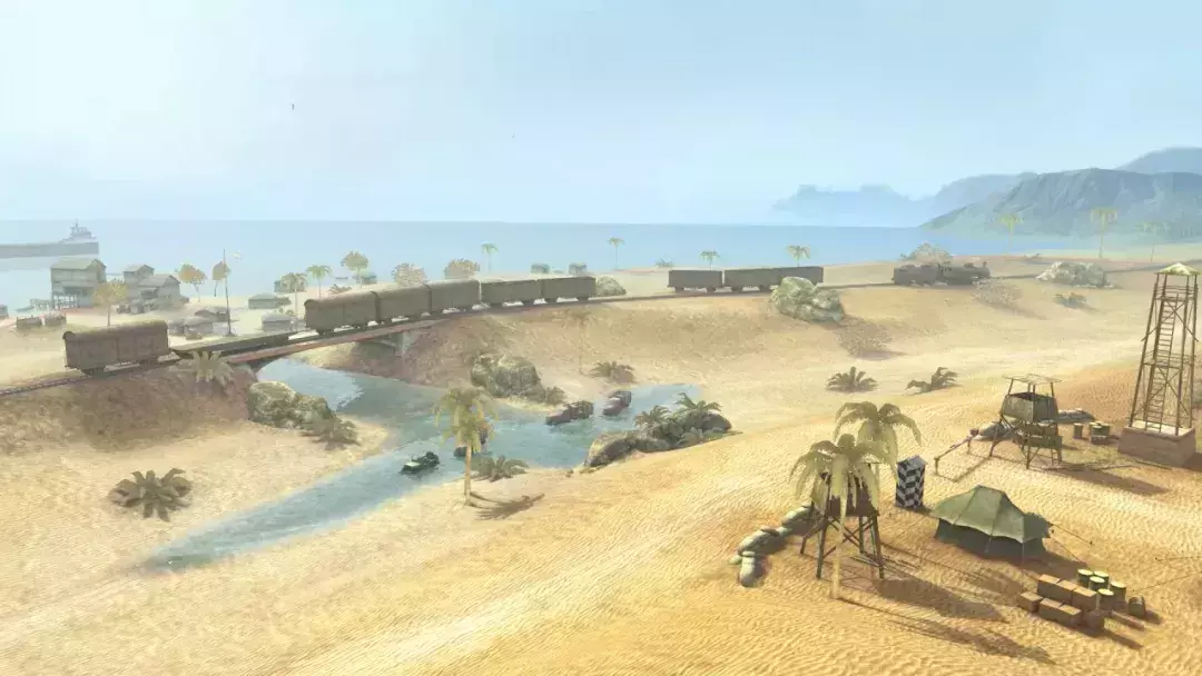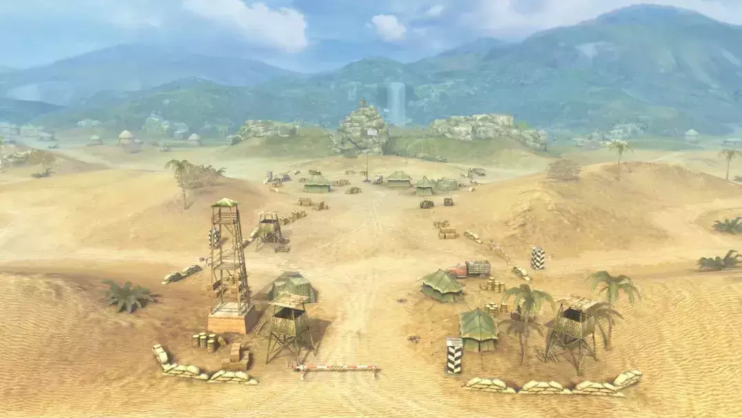 踏入这片沙漠地图,炽热阳光倾洒而下,沙海黄灿灿。山的那边有瀑布飞流直下,为这荒芜之地添了丝灵动。一条溪流蜿蜒穿过沙漠,与铁轨相交。