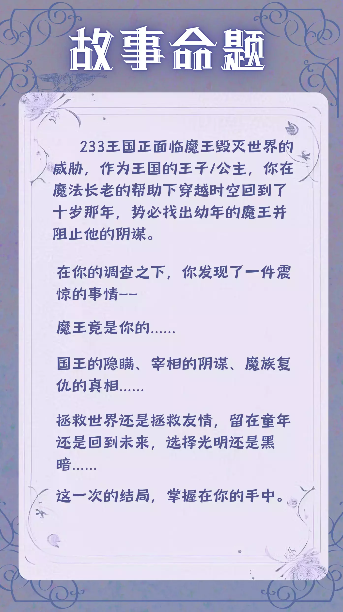 233王国正面临魔王毁灭世界的威胁,作为王国的王子/公主,你在魔法长老的帮助下穿越时空回到了十岁那年,势必找出幼年的魔王并阻止他的阴谋。