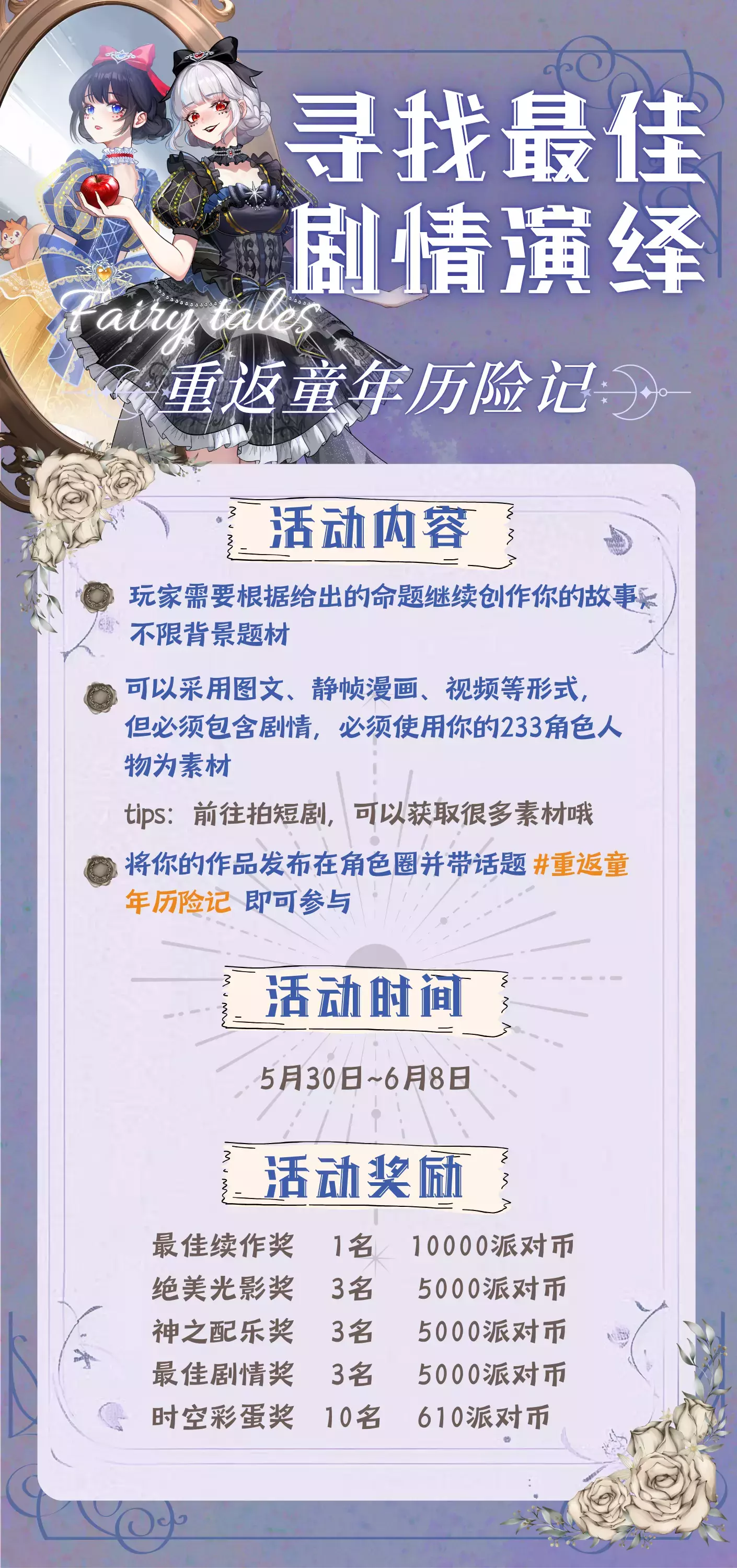 🌹玩家需要根据给出的命题继续创作你的故事,不限背景题材。可以采用图文、静帧漫画、视频等形式,但必须包含剧情,必须使用你的233角色人物为素材