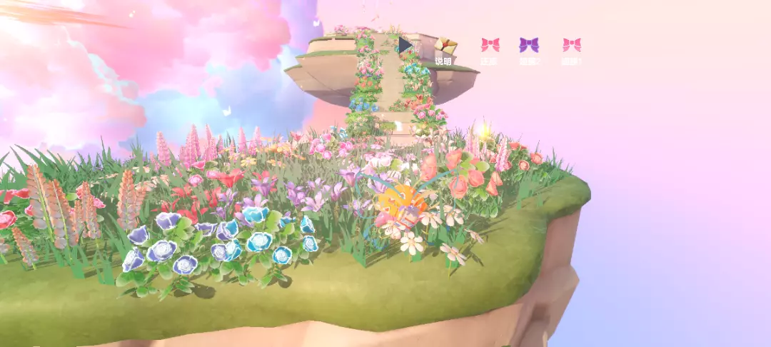 第一张打卡图片的右上角可以看到地图中的一些功能哦,有地图的说明,还有两个小蝴蝶翅膀的COS服,是蓝黄配色和粉绿配色的翅膀,都是超级美的,拍照不喜欢小翅膀也可以点击还原哦🎐