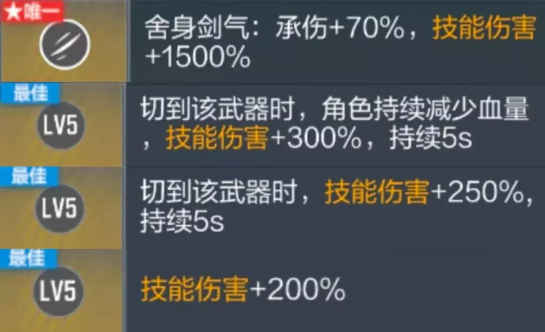 切到该武器时,角色持续减少血量,技能伤害增加300%,持续5s