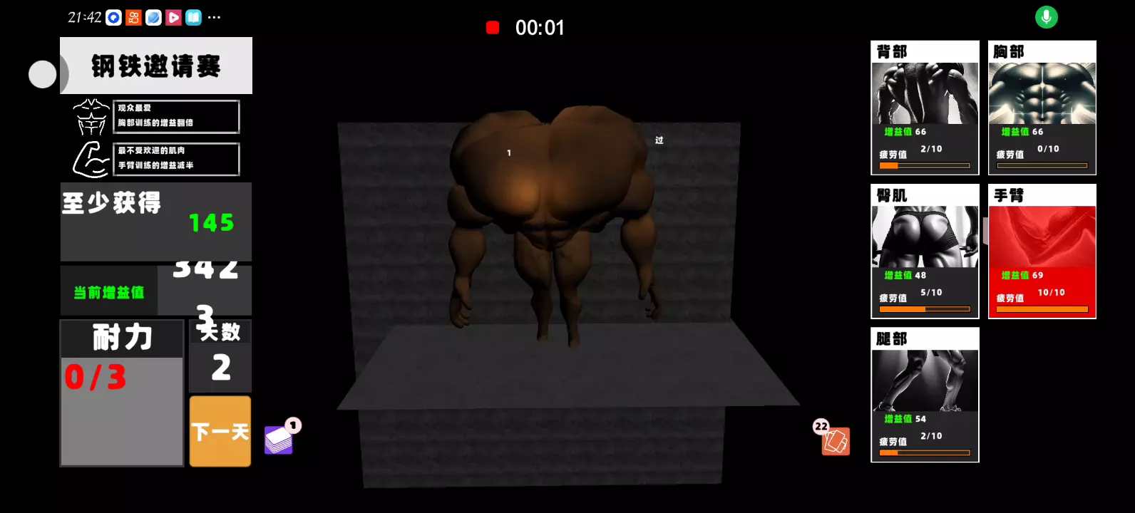 阿诺模拟器中文版来袭!让你成为终极肌肉怪兽! 【游戏玩法】 锻炼、塑造你的身体,赢得比赛。达到最低的 增肌值 (Gains) 以获胜。 ·打出训练卡来获取 增肌值,比如使用“手臂”卡让肱二头肌炸裂! ·别太拼!过多的 疲劳 (Fatigue) 会导致 受伤 (Injury)。 ·使用休息和补剂卡来增加 增肌值 或减少肌肉 疲劳。 ·痴迷臀部?没问题!做个“臀肌信仰者”,练出最强蜜桃臀! 前往 增肌镇 (Gains-Town) 的旅程艰难,做出明智决策,成为终极肌肉怪兽!