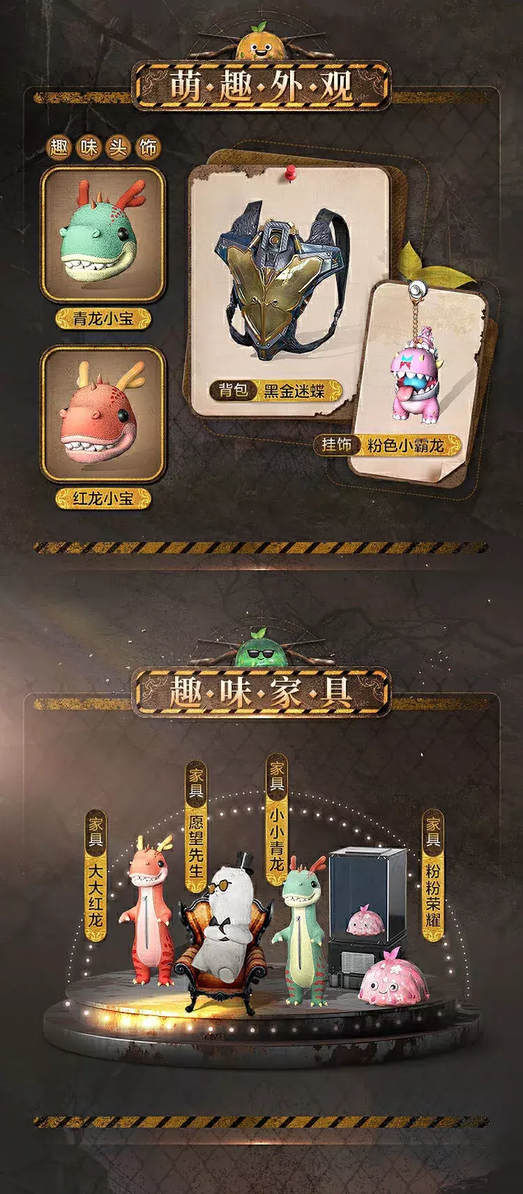 携同一大波趣味玩法和专属惊喜降临废土!在丰收广场邂逅“TA”们,——无论是被称之为【愿望先生】的酷炫羊驼、还是萌态可掬摇摇晃晃的【小小青龙&大大红龙】,都可以作为【永久家具】收入囊中,和幸存者在庄园中作伴!同款【青龙小宝 & 红龙小宝】头饰、限定背包【黑金迷蝶】、萌趣挂饰【粉色小霸龙】、头像、名片框、头顶表情等多种奖励,等待你一起抱回家!