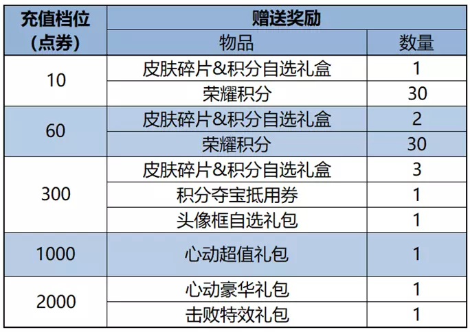 皮肤碎片&积分自选礼盒:打开礼包可任意选择以下奖励之一:荣耀积分*10或皮肤碎片*1