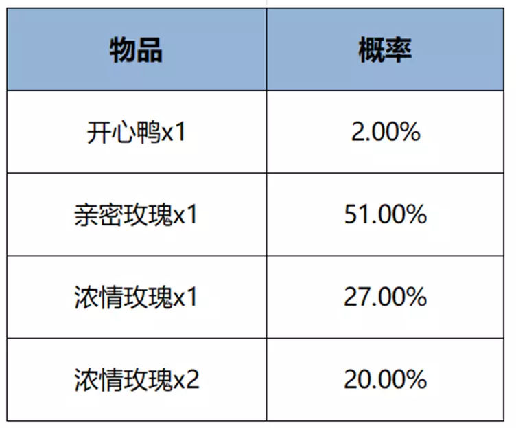 购买红蓝对决(1日),可额外获赠一个礼包,打开后可随机获得以下之一:开心鸭x1、亲密玫瑰x1、浓情玫瑰x1、浓情玫瑰x2。累计20次至少可获得开心鸭x1。