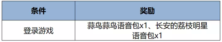 活动期间登录游戏即可领取蒜鸟蒜鸟语音包、长安的荔枝明星语音包!