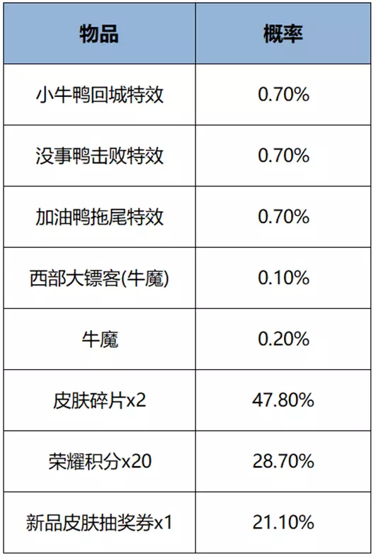 购买红蓝对决(1日),可额外获赠一个礼包,打开后可随机获得以下之一:小牛鸭回城、没事鸭击败、加油鸭拖尾、西部大镖客(牛魔)、牛魔、皮肤碎片x2、荣耀积分x20、新品皮肤抽奖券x1。累计225次必得全部局内特效。