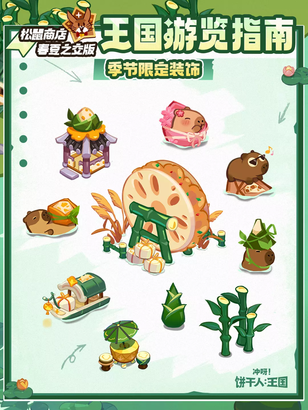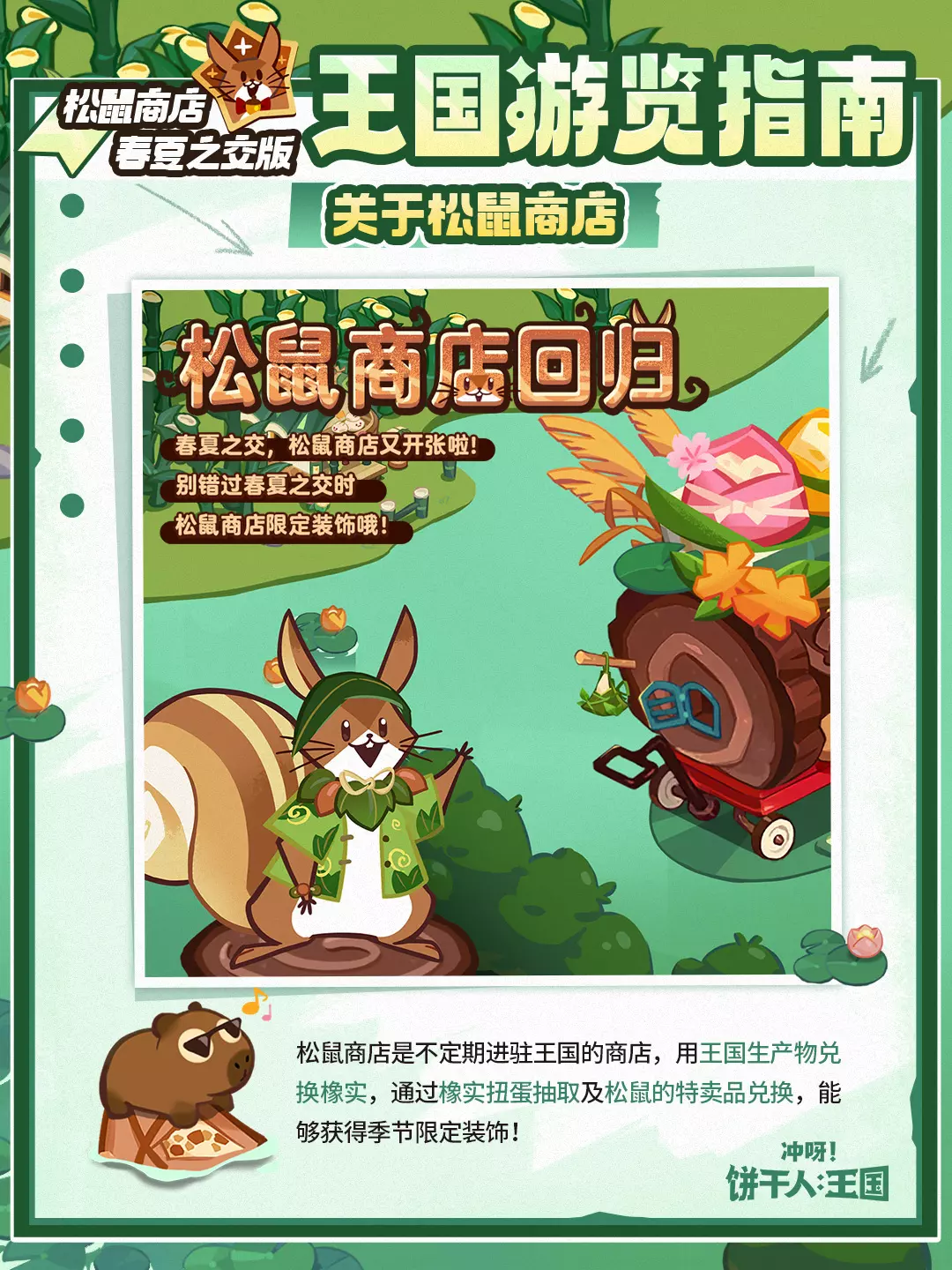 雨随花瓣落下,蝉与蛙声合奏,松鼠商店伴随着夏风一同回到了王国!本次商店装饰上新,不要错过了限定装饰哦~