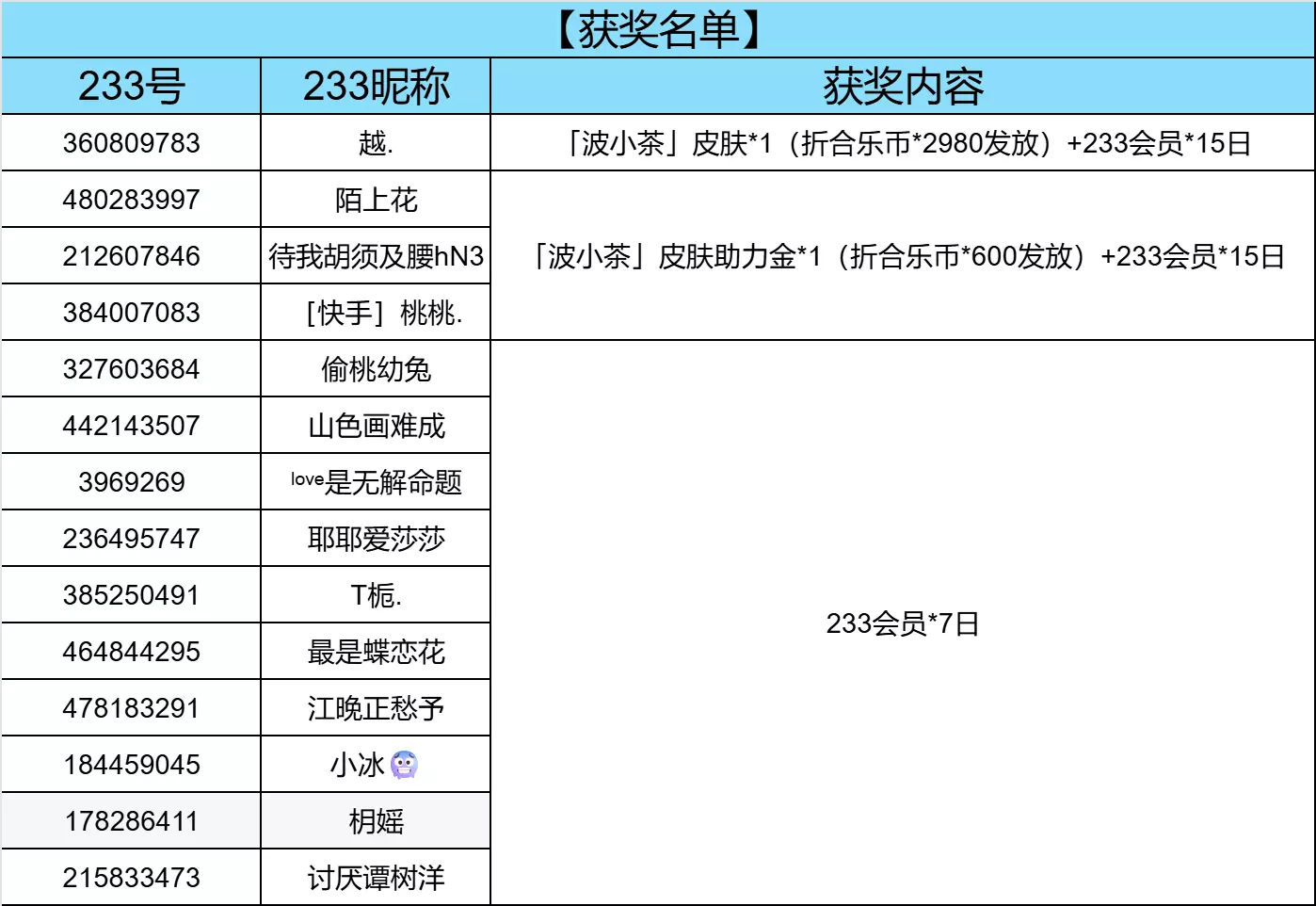 随机抽取3名冒险家送出:「波小茶」皮肤助力金*1(折合乐币*600发放)+233会员*15日