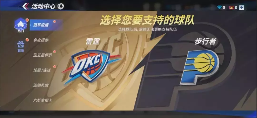 6月6日活动开启后,在【活动-热门-冠军应援】直接pick你支持的队伍(步行者/雷霆)!
