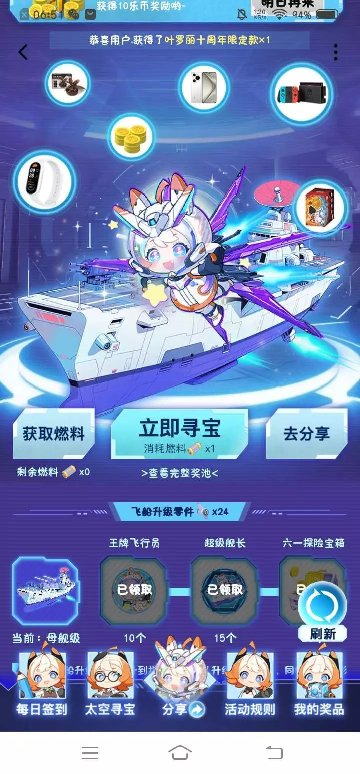 61寻宝活动开启了,收集飞机零件和签到都即可获得飞机零件,收集多少个可以按照对应的获得勋章《王牌飞行员》《超级舰长》最后获得20个飞机零件,可获得六一大礼包,落币奖励和苹果手机等等!想要的家人们赶紧去六一太空寻宝吧?我获得了20个乐币,最高可获得8888乐币哦!