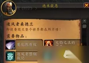 2、然后,进入熔火之心副本:熔火之心是风剑任务的起始副本~怀旧服注意了,如果没有做进门任务就需要接任务跑一趟黑石深渊获得进入熔火之心的资格,正式服和黑石山二楼,岩浆旁边NPC对话直接就能! 3、最后,击败 BOSS 获取左右颅: 左半部分:由熔火之心的 5 号 BOSS 迦顿男爵掉落。迦顿男爵会点名给两个负面效果,一个是持续掉蓝,可以被驱散;另一个是冲击波炸血,无法驱散,只能硬扛。打这个 BOSS 时,可以将其拉到有天花板的山洞里,这样被点名炸飞也不会摔掉太多血。 右半部分:从熔火之心的 4号 BOSS 加尔掉落,这个 BOSS 相对而言就简单很多啦~ 第二步:触发并接受任务 1、找到德米提思:当至少获得一块逐风者的禁锢之颅后,前往希利苏斯西北角找到 NPC 德米提恩。空手去找他时,他会说一些提示的,当拿着逐风者的禁锢之颅时,他会交给一个道具【复生之瓶】。 2、接受任务:右击包里的【复生之瓶】会接到“复生之瓶”任务,查看复生之瓶后,再和德米提恩对话他会给出新任务“逐风者桑德兰”。 第三步:收集任务材料 1、10 块腐化源质锭: 获取源质矿石:源质矿石只有黑翼之巢的小怪黑翼技师掉落。由于一次只会掉落3-5 个,所以其价格较贵。 学习熔炼图纸:图纸在黑翼之巢5号 BOSS 和6号 BOSS 的交接点处,需要使用牧师的心灵控制技能控制元素大师克里西克,才能学会熔炼源质锭~ 合成源质锭:准备好 10 个奥金锭(通过熔炼 100 个瑟银锭和奥术水晶合成获得)、10 个炽热之核(从熔火之心小怪掉落)、30 个元素助熔剂(从锻造材料 NPC 购买获得)以及源质矿石,在熔炉处熔炼岀 10 块源质锭~ 2、火焰之王的精华:接了任务之后去杀掉熔火之心的总 BOSS 拉格纳罗斯,必掉火焰之王的精华。 3、左右两部分禁锢徽记:就是这两,呵呵,完全看脸,而且只能单个角色刷才行。