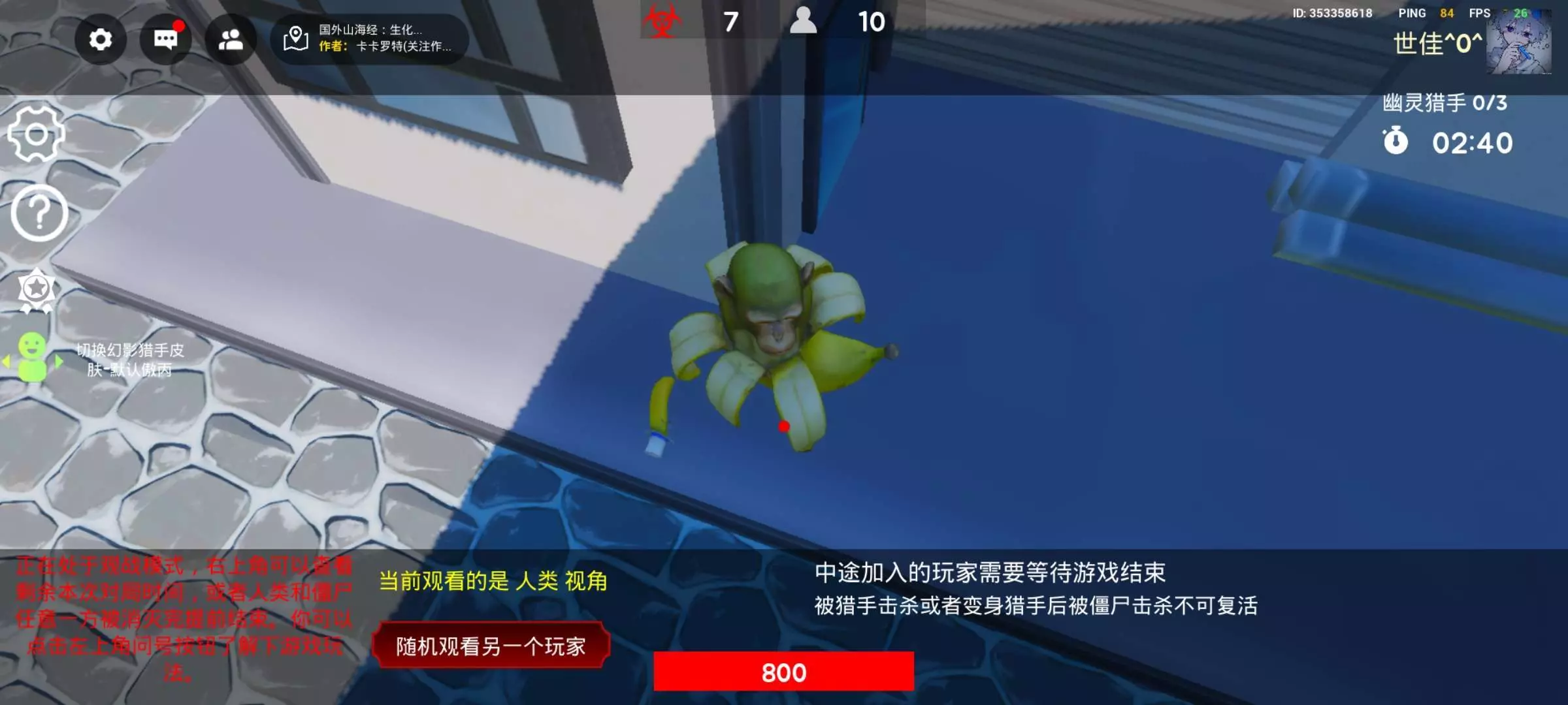 我自己,还不能换别的观战!第二个是第三把,我和一个路人对友不知道为什么总之只有我和它卡了不能动,直到后面被怪打了,变成怪之后才能动。第4把,就是在我进到那建筑物蹲下之后就不能动了,一直卡在那个位置,直到后面就一直卡在那里,直到下一把。!而且是同一个房间!!!
