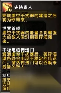 世界首领:虚空干扰器的能量会将大的敌人吸引到破碎海滩。 (破碎海岸新的世界BOSS机制和群岛的11只老世界BOSS不一样,具体机制还在讨论,但是和这个功能肯定是有关的。) 相关帖子: 7.2PTR 新增4只世界BOSS掉落信息890+ 以及 视频,布胖再临! [/read.php?tid=11145902] 不稳定的传送门:虚空干扰器后,破碎海滩各处会出现不稳定的传送门。传送门可以召唤来危险的敌人。 (不稳定的传送门,简单的说,就是用来刷虚空碎片的……) 相关帖子: [本是同根生,相肝何太急]虚空碎片所需的数量大增!已成为最重要的新货币,赌橙需5000碎片一次了 [/read.php?tid=11152744] 制甲工匠的奖章:技艺高超的技师所付出的努力将得到回报,他们可以制造传奇物品。