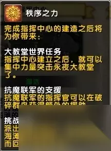 (在破碎群岛做任务的时候,会有一些对应的抗魔联军成员来帮助你。比如欠了很多份情的守望者,守望者与你同在!) 挑战任务:派出合格的勇士,深入破碎海滩的核心地区,完成危险而回报丰富的任务。 (这个具体效果未知,应该是会解锁奖励更好的随从任务。) 协调强化