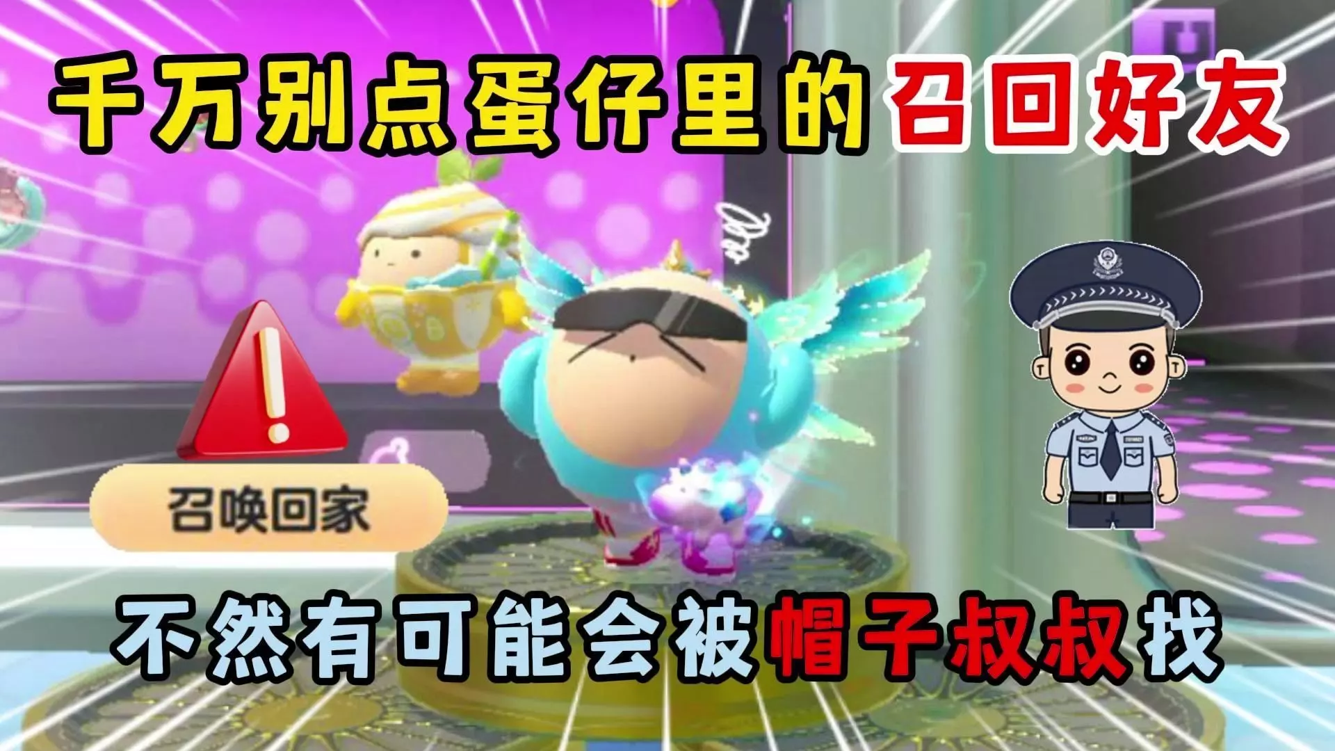 回复蛋仔派对:千万别点蛋仔里的召回好友,不然有可能会被帽子叔叔找!