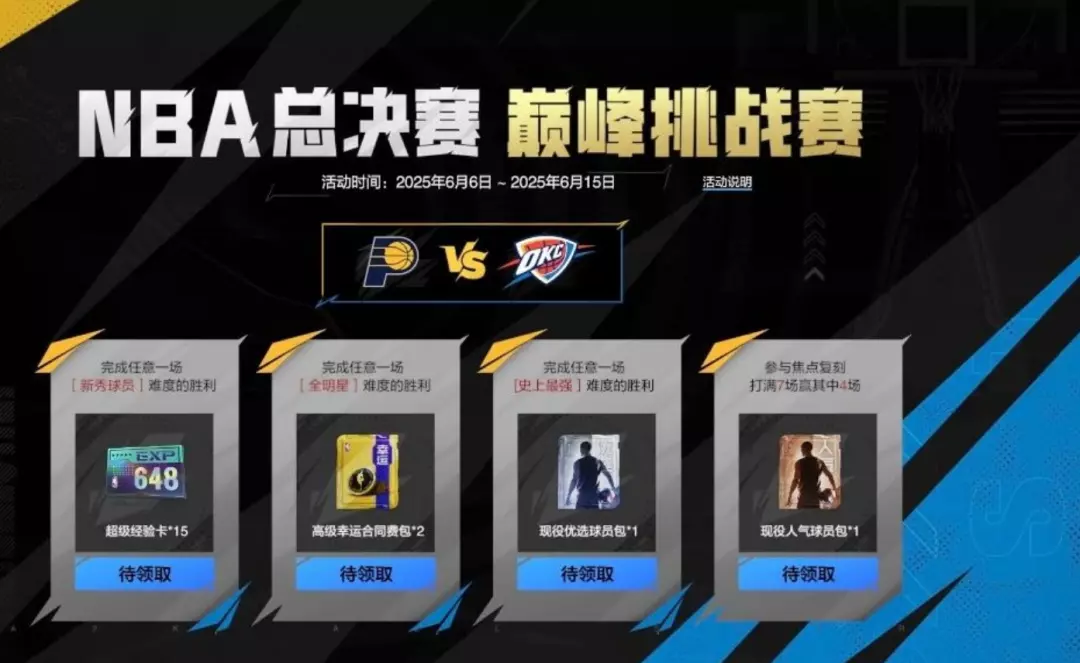 现在在NBA2K手游中,NBA总决赛巅峰挑战赛活动也已经同步开启!