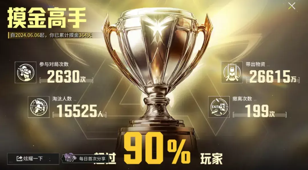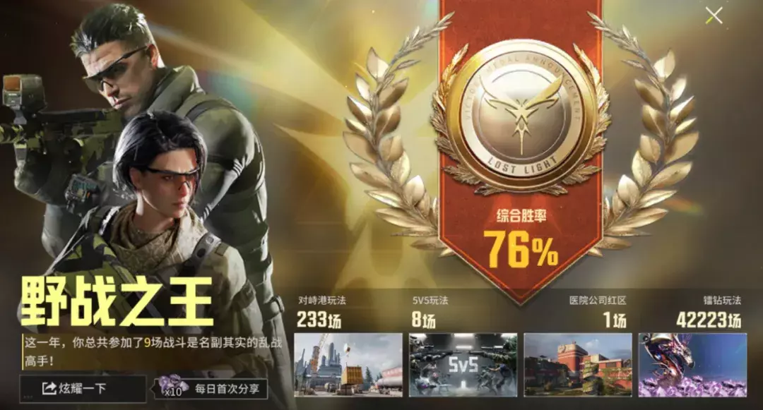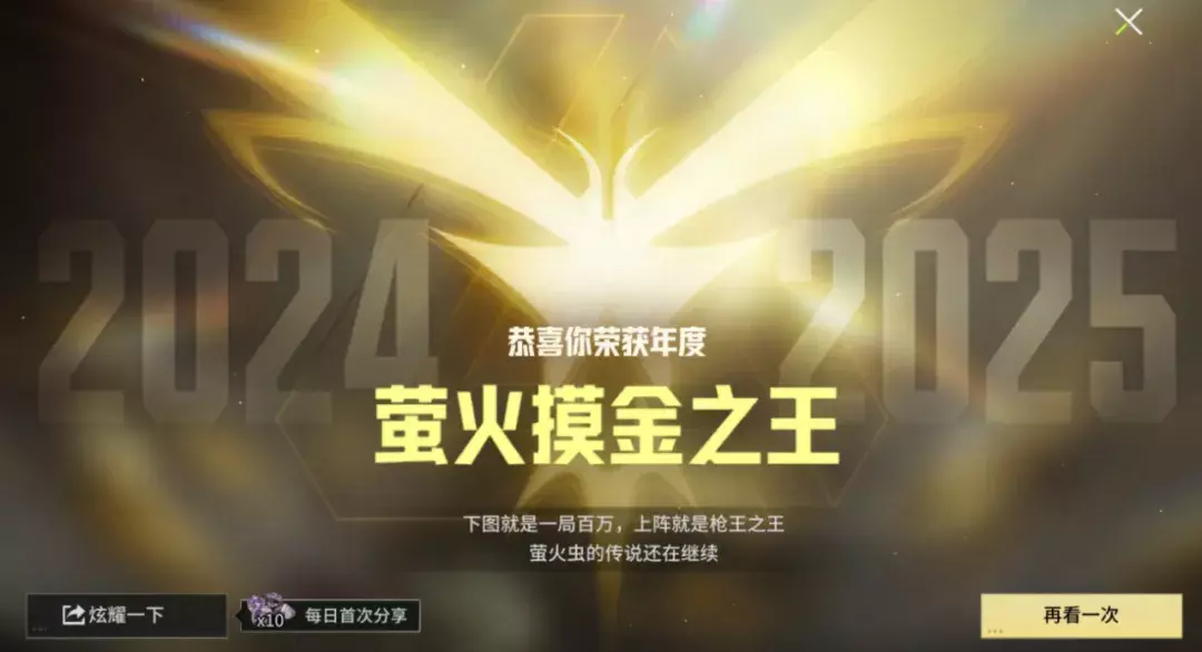 恭喜你,已经回顾了过去一年所有高光时刻,每一场战斗,都见证了萤火虫们的来时路,以不凡铸非凡,萤火摸金之王的称号非你莫属