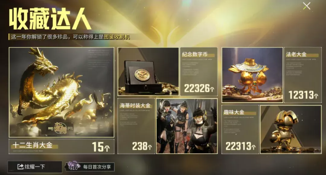 这一年你解锁了生肖大金、法老大金、海蒂大金还有2万多个数字纪念币,名副其实的图鉴收割机