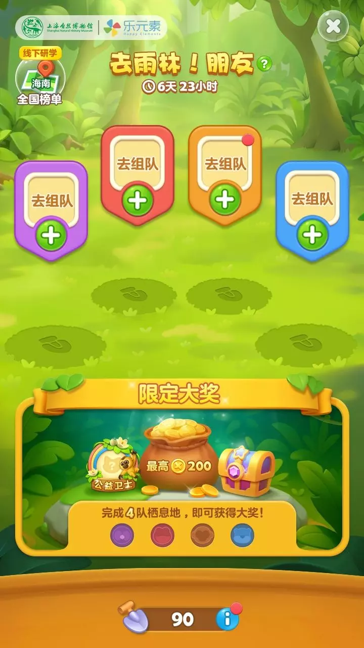小村民需要与4位玩家分别组成4支队伍,共同守护升级海南热带雨林内4种神秘珍稀动物的栖息地