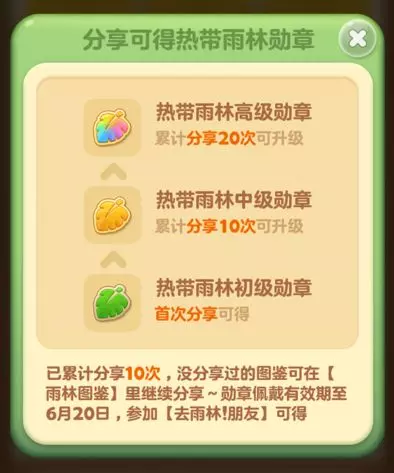 活动期间累计分享雨林图鉴1次、10次、20次可获得:热带雨林系列勋章