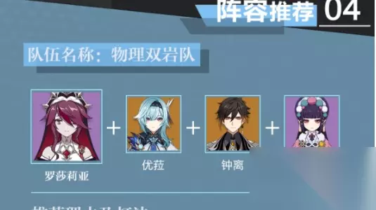 五、阵容搭配 1、罗莎莉亚+优菈+钟离+云堇 这套阵容利用罗莎莉亚的元素爆发提供的暴击率与物理减抗,配合云堇的普通攻击加伤与钟离的护盾减抗,提升优菽造成的所有伤害。