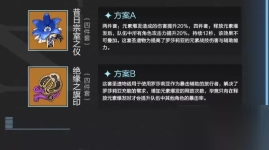 四、圣遗物推荐 1、四宗室 两件套:元素爆发造成的伤害提升20%,四件套:释放元素爆发后,队伍中所有角色攻击力提升20%,持续12秒,该效果不可叠加。这套圣遗物为提高了罗莎莉亚的元素战技伤害与辅助能力。 2、四绝缘 这套圣遗物适用于使用罗莎莉亚作为暴击辅助的旅行者,解决了罗莎莉亚充能的需求。增加元素爆发的释故次数。毕竟只有在释放元素爆发时才会提升队伍中其他角色的暴击率。